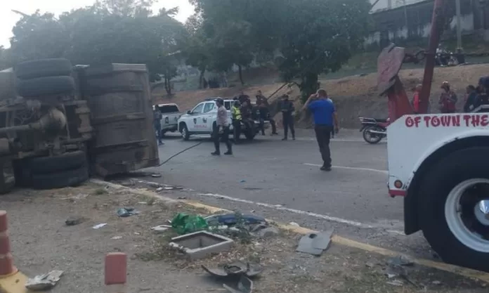 En las imágenes, se puede observar cómo un vehículo de carga pesada volcó, dejando a dos personas en el suelo. Autoridades se presentaron en el lugar para realizar el levantamiento del accidente y prestar la debida asistencia.