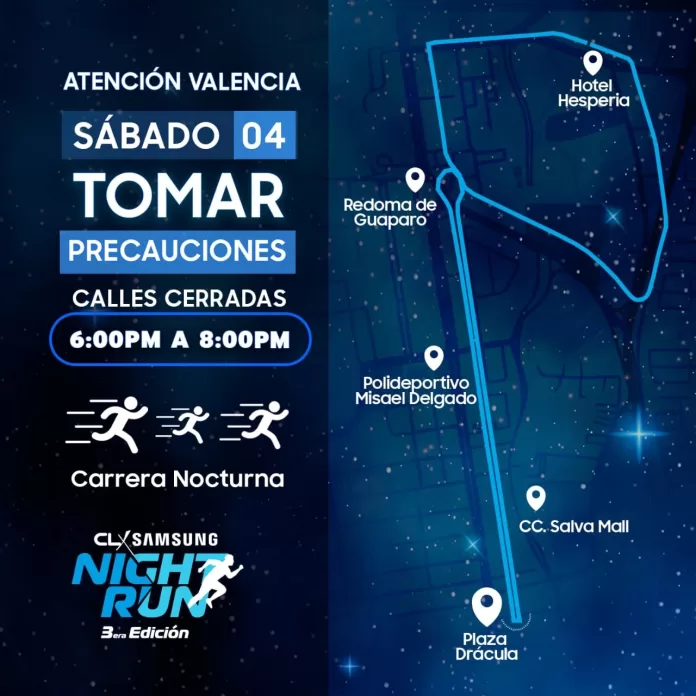 El día de mañana sábado 4 de noviembre, las siguientes calles de Naguanagua y Valencia estarán cerradas de forma parcial mientras se realiza la 3° edición de la CLX Night Run: Callejón Mañongo, Redoma de Guaparo, av. Universidad, hasta la Villa Olímpica; av. 168 Salvador Feo La Cruz Este – Oeste, av. Hispanidad y la Av. 100 Bolívar Norte, desde la redoma de Guaparo hasta la altura de la Plaza Drácula y el distribuidor Las Clavelinas.