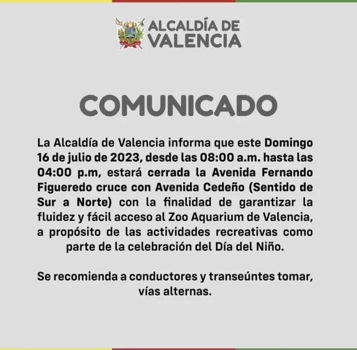 Domingo 16 de Julio de 2023, desde las 08:00 a.m. hasta las 04:00 p.m, estará cerrada la Avenida Fernando Figueredo cruce con Avenida Cedeño (Sentido Sur a Norte), con la finalidad de garantizar la fluidez y fácil acceso al Zoo Aguarium de Valencia a propósito de las actividades recreativas en el marco de la Celebración del Día del Niño.