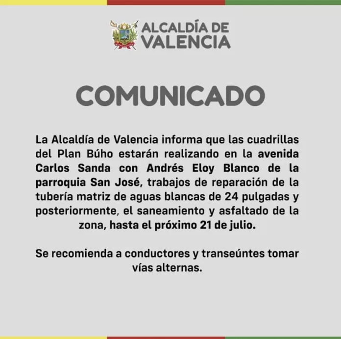 La Alcaldía de Valencia informa que las cuadrillas del Plan Búho estarán realizando en la avenida Carlos Sanda con Andrés Eloy Blanco de la parroquia San José, trabajos de reparación de la tubería matriz de aguas blancas de 24 pulgadas y posteriormente, el saneamiento y asfaltado de la zona, hasta el próximo 21 de julio.