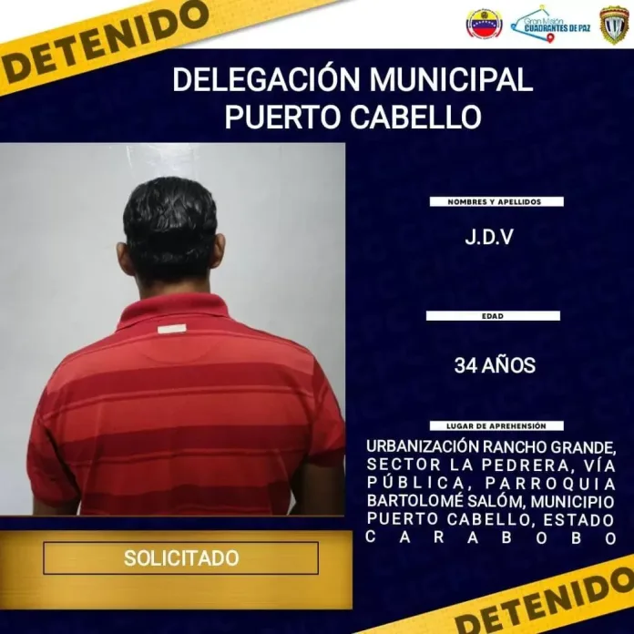 La información se conoció a través de la red social oficial del Cicpc, dónde indica que la Policía Científica sigue trabajando en el combate del delito, en la lucha contra la delincuencia organizada, por la seguridad de la población venezolana y mediante arduas investigaciones de campo realizadas por pesquisas de la Coordinación de Investigaciones de delitos Contra la Propiedad, se logró la aprehensión del ciudadano identificado con las iniciales; J.D.V, quién se encuentra solicitado, ante el Juzgado Tercero de Primera Instancia Estadal y Municipal en lo Penal en Funciones de Control del Circuito Judicial del estado Carabobo, Extensión Puerto Cabello, por el delito de Hurto Calificado y Agavillamiento.