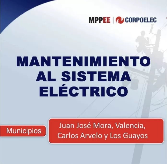 La estatal Corpoelec anunció un nuevo corte programado de electricidad, para este jueves 17 de agosto, que afectará a los municipio Juan José Mora, Valencia, Carlos Arvelo y Los Guayos, en el estado Carabobo.