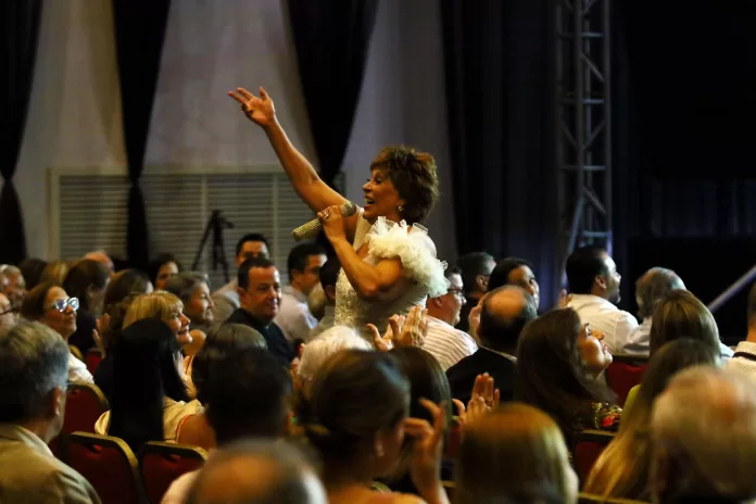 Con un vestido blanco, la “show woman” de Venezuela apareció en escenario y ofreció un espectáculo de más de una hora en el que incluso bajó de tarima e interactuó con el público presente, mientras interpretaba “Una noche con Floria Márquez”, “Algo más que boleros”, “La cosa es amar”, “10 años de amor”, entre otros temas de su amplia carrera musical.
