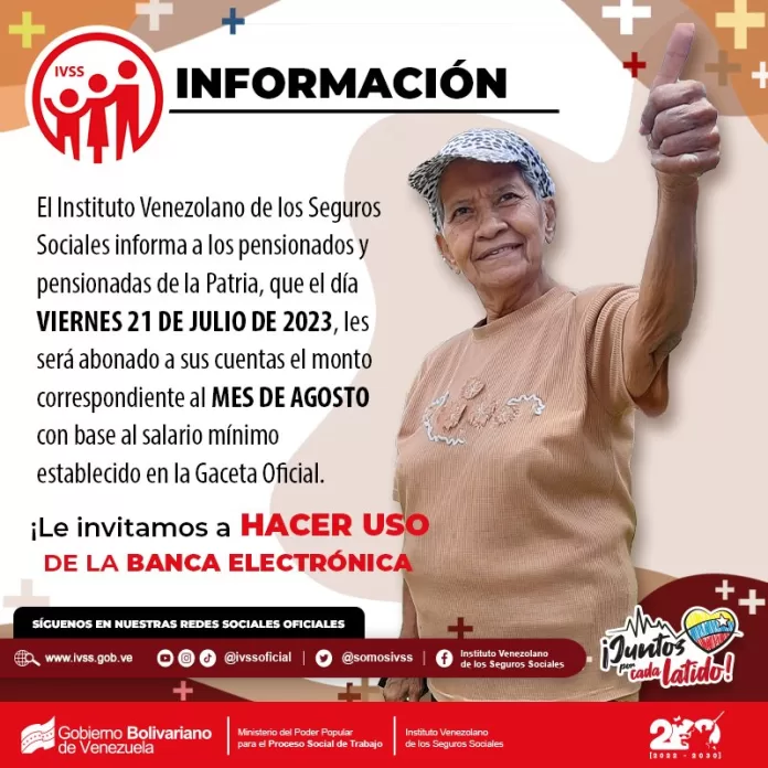 «El IVSS informa que el pago de la pensión correspondiente al mes de agosto se realizará este viernes 21 de julio», así lo indicó la institución en su red social Twitter.