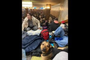 Mascotas y sus dueños buscan refugio en medio de bombardeos rusos nocturnos en Kiev. (Foto: Composición Twitter)