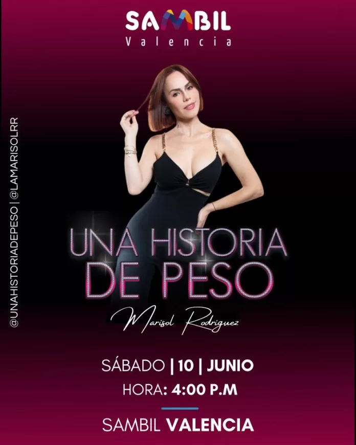 La talentosa y carismática locutora, tv host y empresaria venezolana con más de 20 años de trayectoria en radio y tv Marisol Rodríguez presentará en Valencia, a petición del público, su conversatorio «historia de peso». Una actividad abierta a todo público con la que está haciendo una gira nacional por todos los Sambil de Venezuela y que llegará a la capital carabobeña este sábado 10 de junio a las 4:00pm, con el objetivo de motivar a todos los que deseen hacer un cambio positivo en sus vidas a través de experiencias vivenciales.