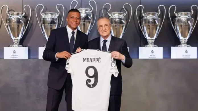 El acto se llevó acabo en la sala de firmas de la Ciudad Deportiva, dónde sonrientes, Mbappé y Florentino se dieron la mano, firmaron el contrato y el galo posó por primera vez el conjunto del equipo con el número “9” en la espalda.
