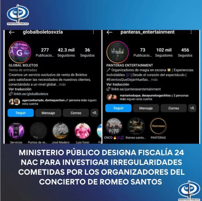 El Ministerio Público (MP) designó este martes a la fiscalía 24 de competencia nacional para investigar y sancionar a las empresas productoras de evento Panteras Entertainment y Global Boletos Venezuela, por las irregularidades y agravios cometidos contra los asistentes al concierto del cantante dominicano Romero Santos, celebrado en la Base Aérea La Carlota, en Caracas, la madrugada de este lunes.