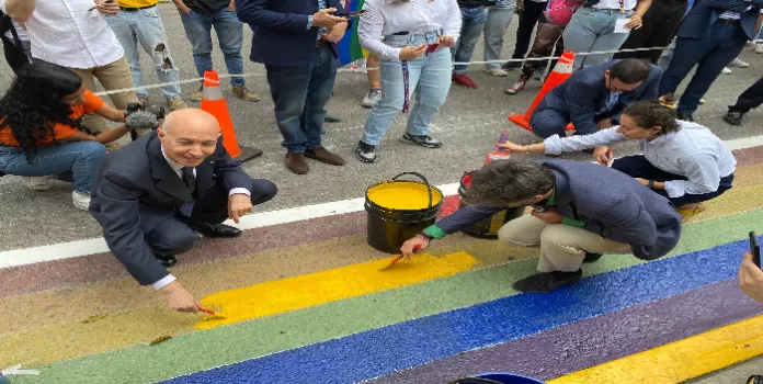 Embajadores y otros representantes del cuerpo diplomático acreditado en Venezuela pintaron este miércoles 17 de mayo la «ciclovía arcoíris» en el municipio