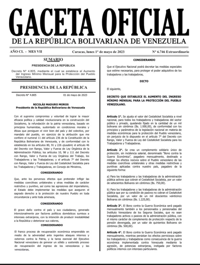Este viernes, 12 de mayo en horas de la noche, se publicó la Gaceta Oficial Extraordinaria N° 6.746 detallando los ajustes realizados por Maduro el pasado 1ero de Mayo.