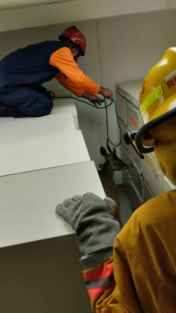Efectivos del Cuerpo de Bomberos la Universidad de Carabobo, con apoyo de Protección Civil y Grupo Rescate Naguanagua, rescataron a un venado que ingresó a las instalaciones del CC Sambil, en Valencia.