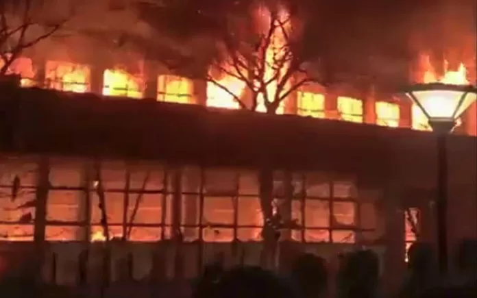 Videos tomados momentos después de que se declarara el incendio muestran enormes llamas anaranjadas que envuelven la planta baja de un edificio y decenas de personas de pie en el exterior.